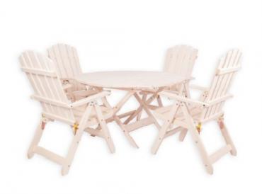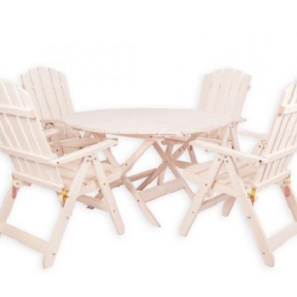 - Apaļš, salokāms galds + 4 salokāmi krēsli ar roku balstiem un regulējamu atzveltni.