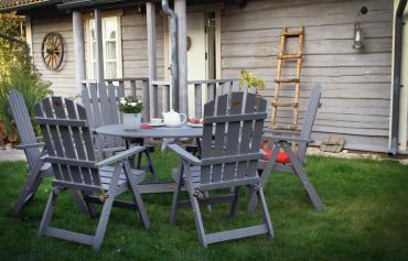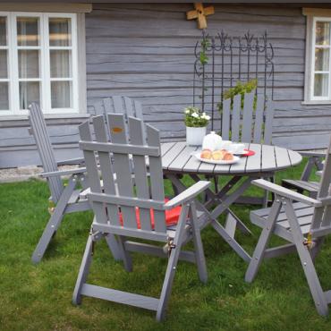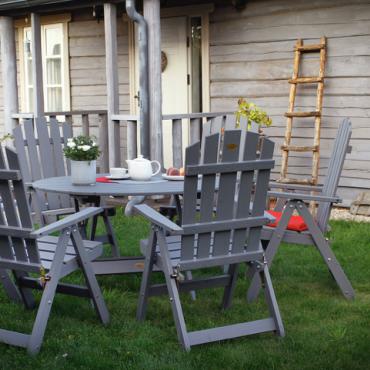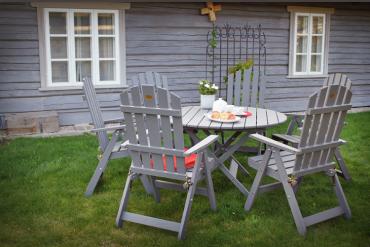 - Apaļš, salokāms galds + 6 salokāmi krēsli ar roku balstiem un regulējamu atzveltni.