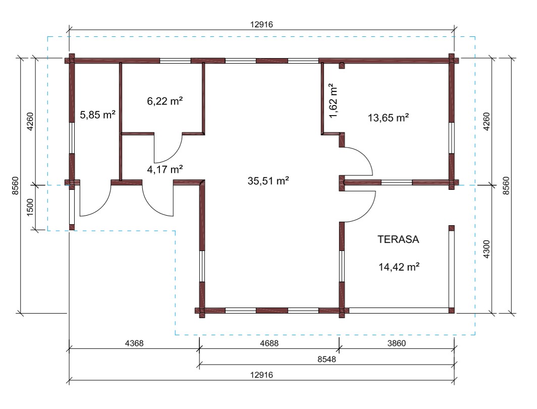 - Наружные и внутренние стены из профилированново клеенново бруса с крестообразными соеденениями или соеденениями городсково типа. Возможны каркасные перегородки;