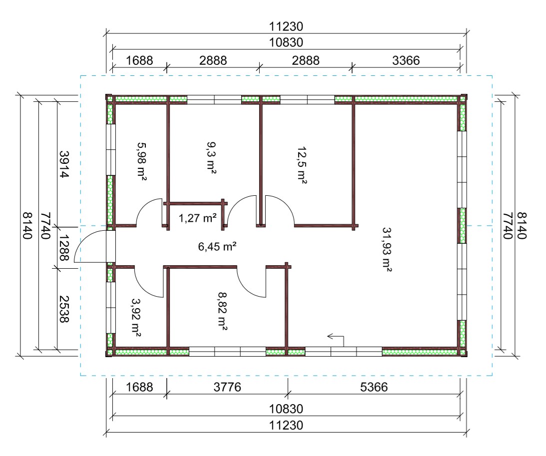 - Наружные и внутренние стены из профилированново клеенново бруса с крестообразными соеденениями или соеденениями городсково типа. Возможны каркасные перегородки;