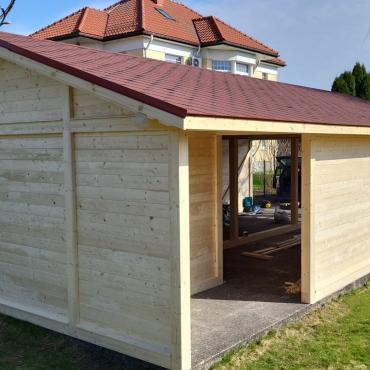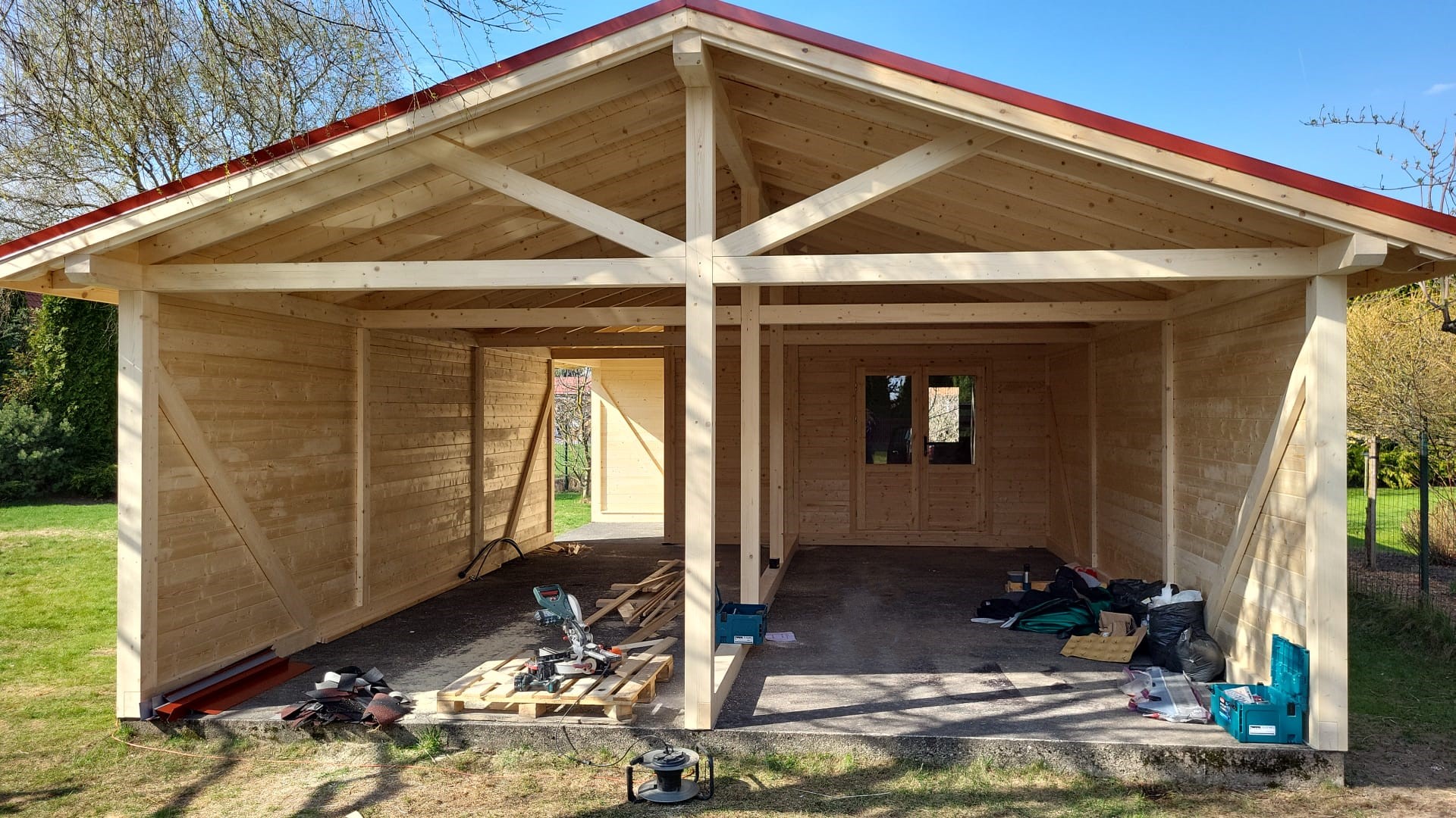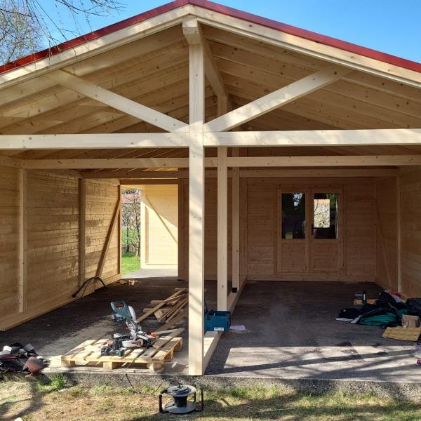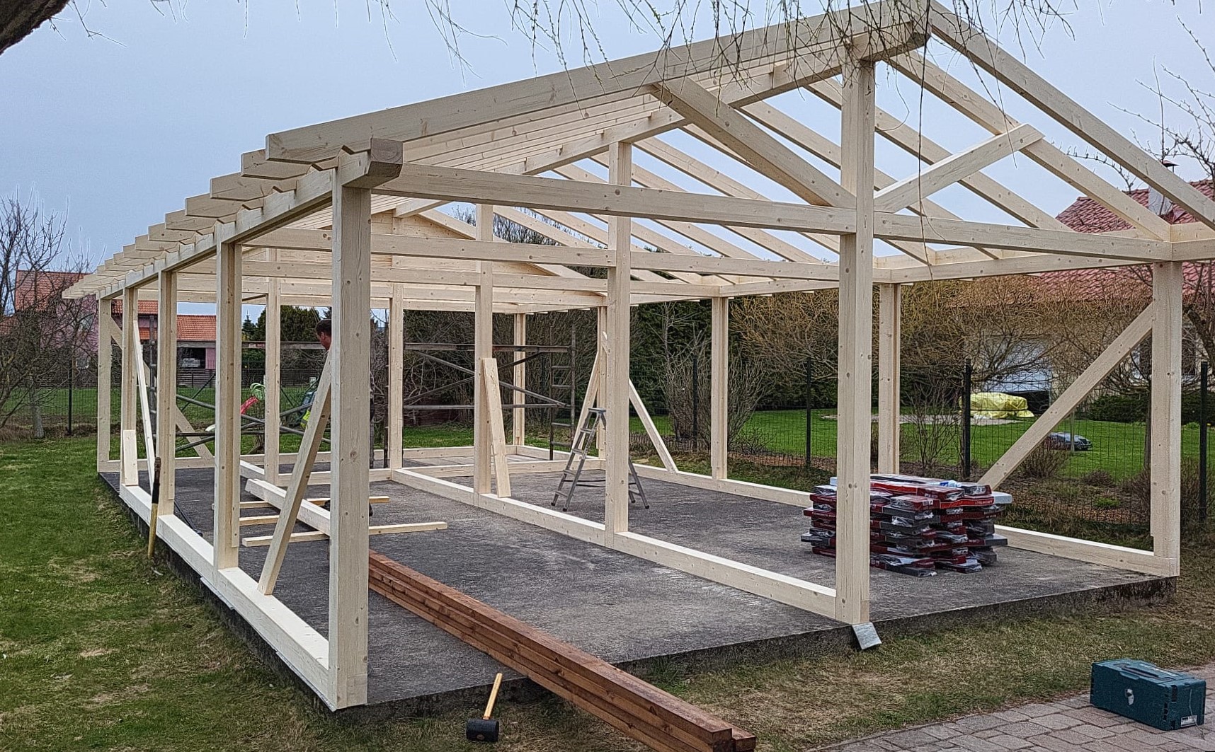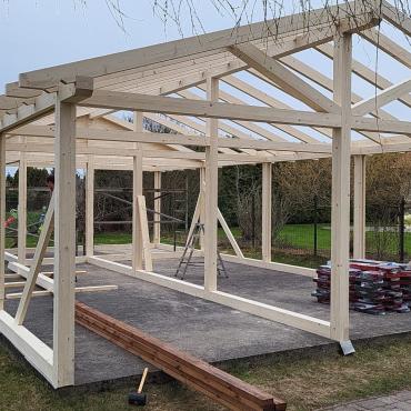- Навес изготовлен полностью из клеенново бруса (конструкция на 70% прочнее чем из массивново бруса):