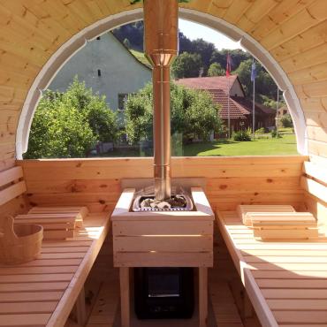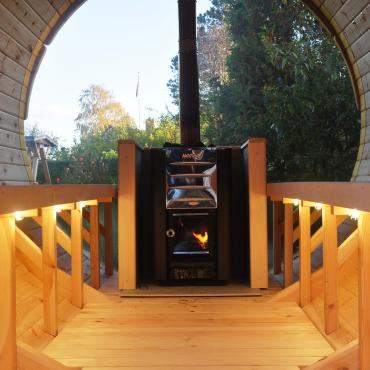 - В переднй части бочки терасса 0,6 m с двумя скамейками;