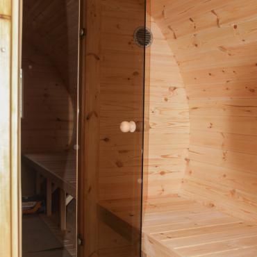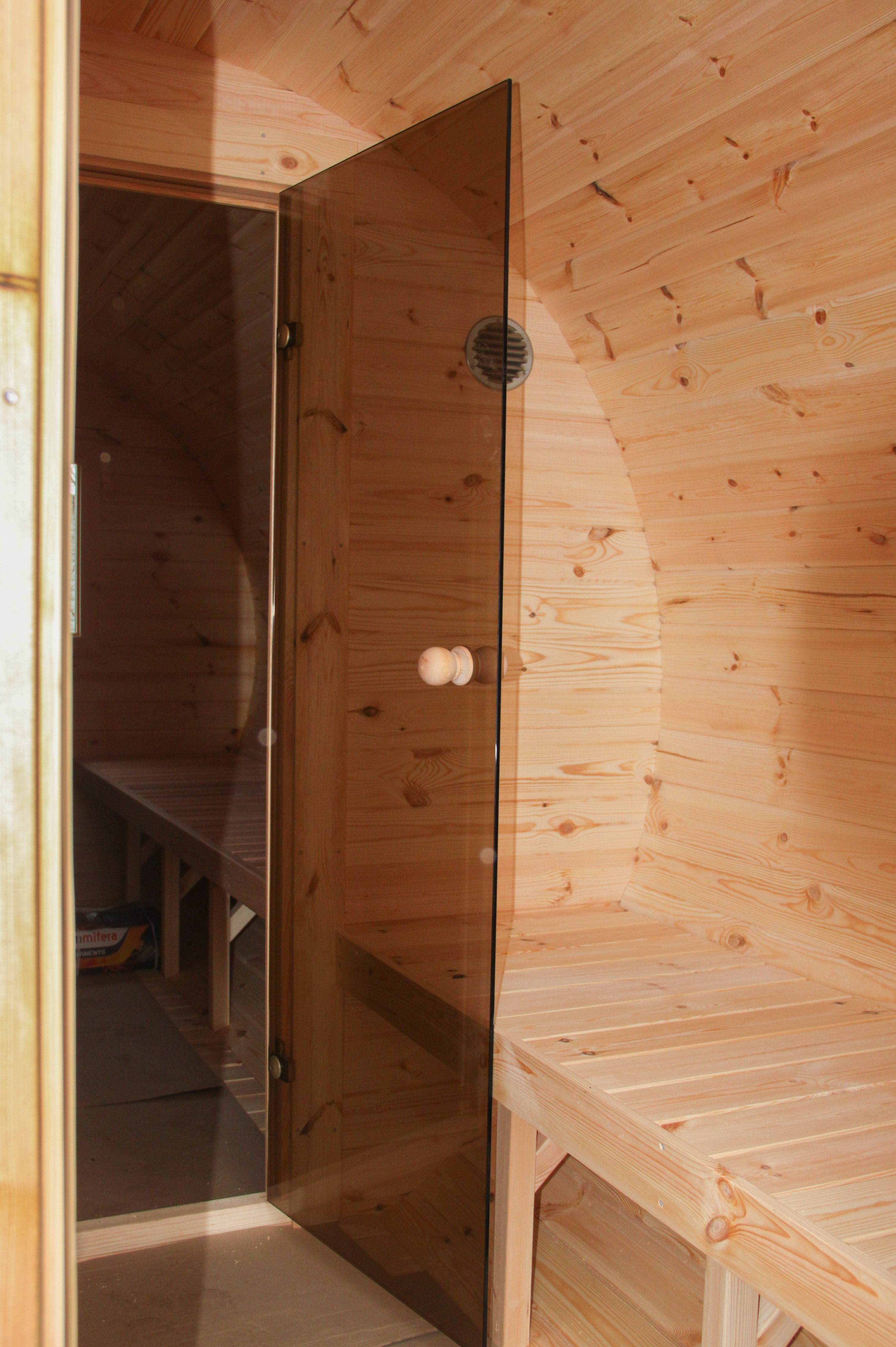 - В парилке панорамное окно на половину стены из тонированного закаленного стекла;