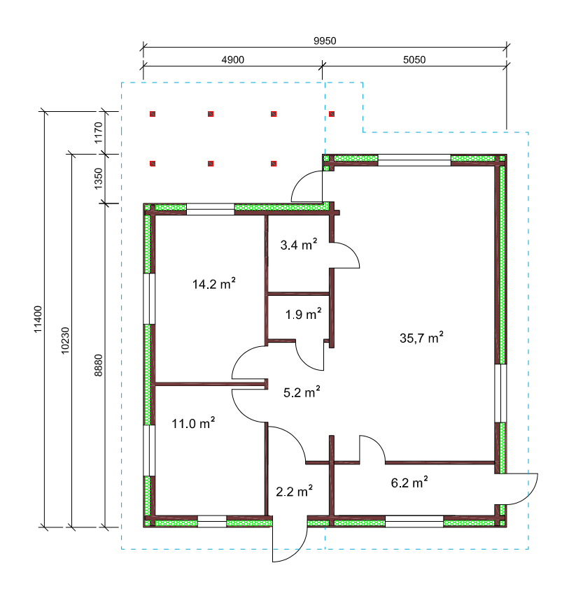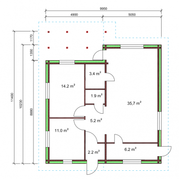 - Наружные и внутренние стены из профилированново клеенново бруса с крестообразными соеденениями или соеденениями городсково типа. Возможны каркасные перегородки;