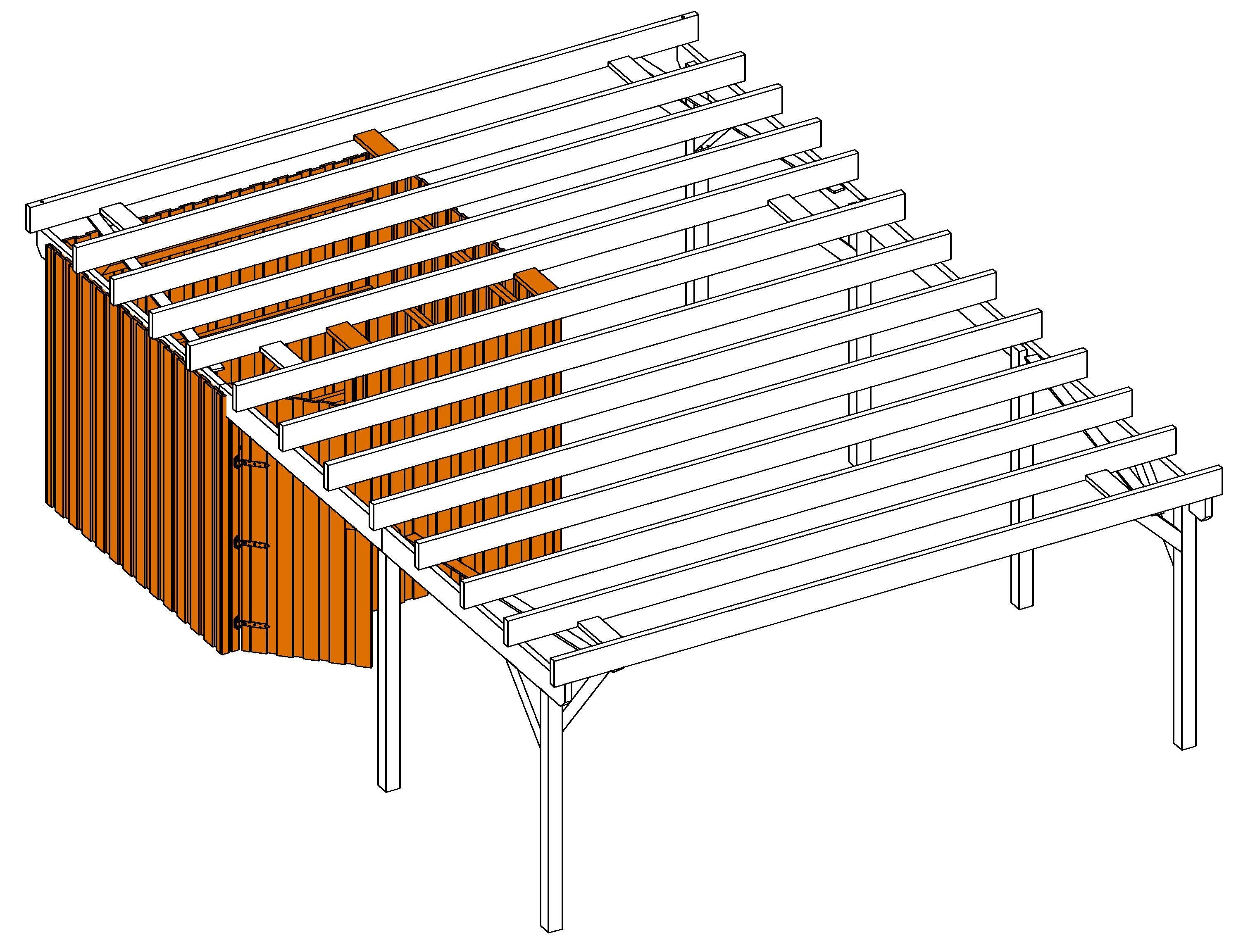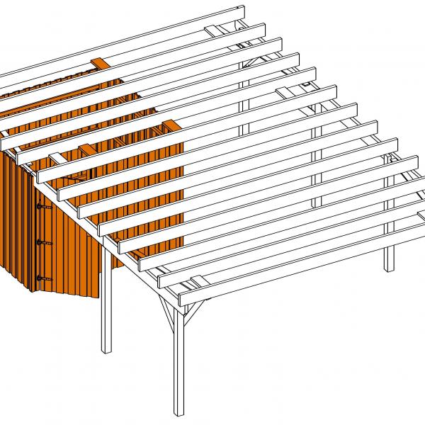 - Каркас навеса изготовлен полностью из клеенново бруса (конструкция на 70% прочнее чем из массивново бруса):
