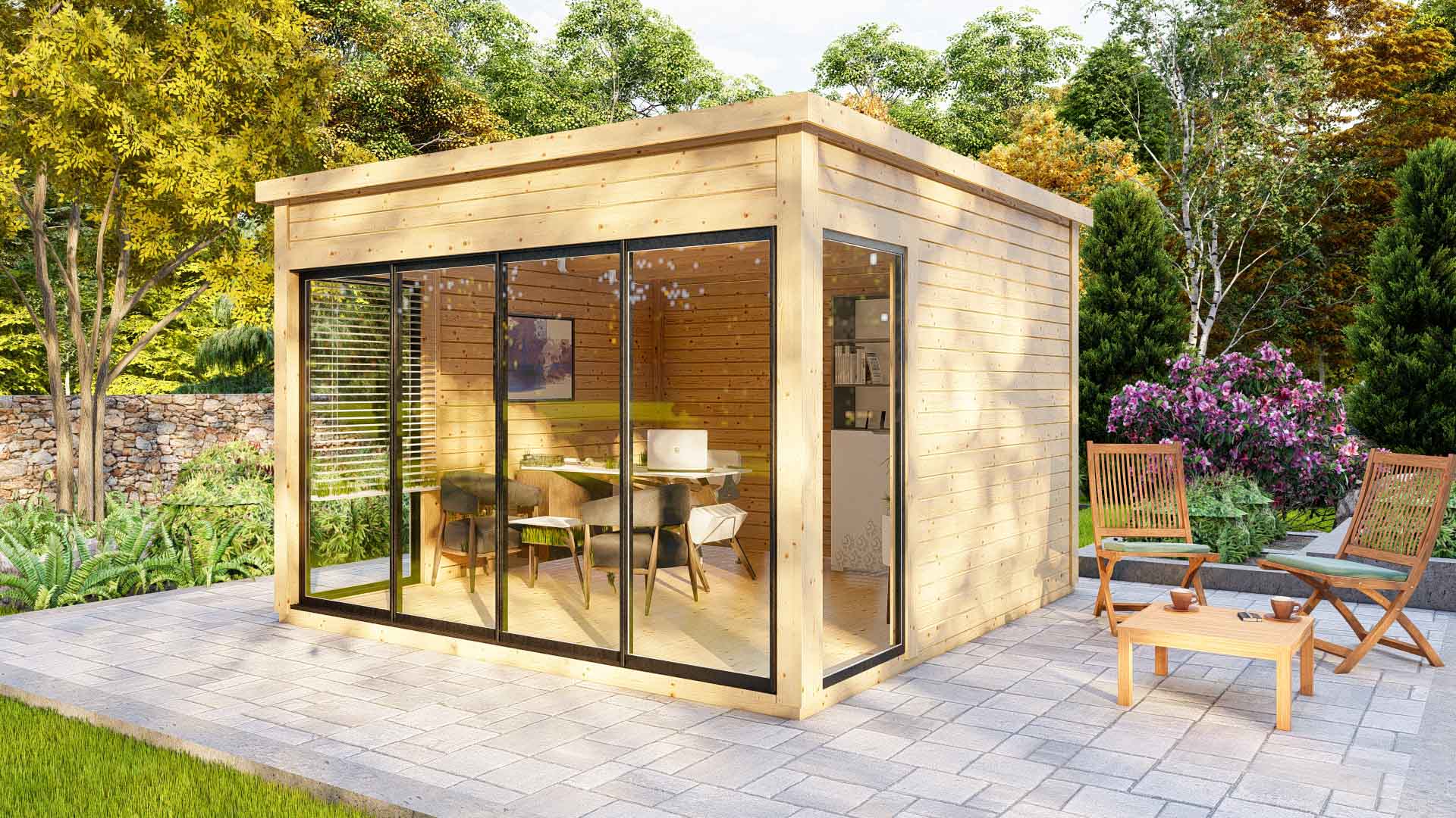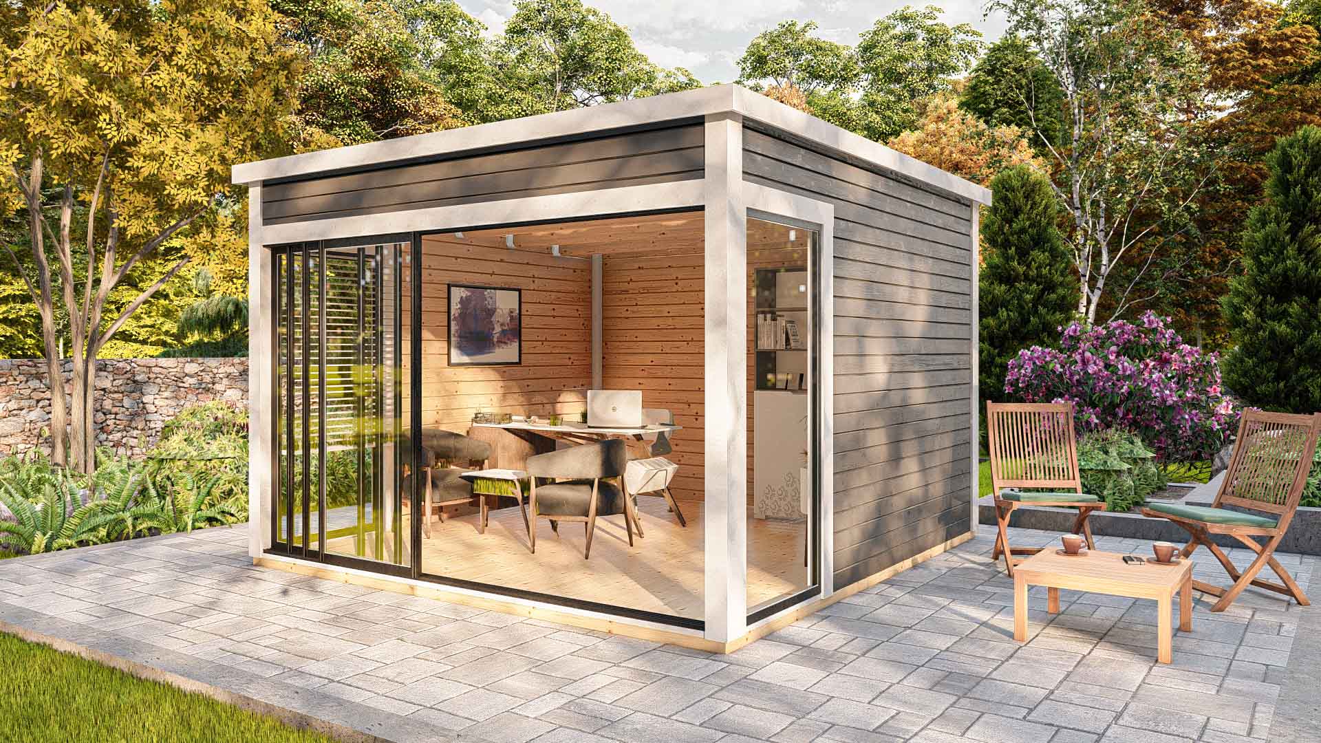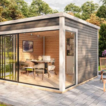 Dārza māja, dārza birojs, vasarnīca, lapene, oranžērija – mūsu jaunā moderno mājiņu sērija ar visplašāko pielietojumu ! Šī gaisīgā telpa ar atbīdāmām stikla sienām ļaus baudīt saules siltumu un vasaras burvīgās smaržas nepieceļoties no sava iemīļotā atpūtas krēsla, vai dīvāna. Tomēr, vēsākos laika apstākļos durvis ir ērti aizbīdāmas, norobežojot no vējiem un aukstuma, bet saglabājot brīnišķīgos skatus uz Jūsu dārzu un apārtni!