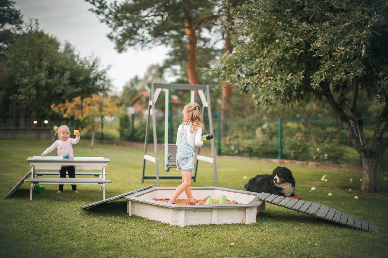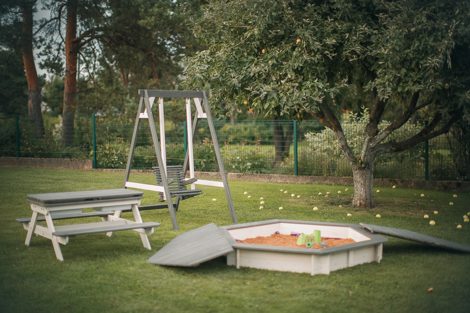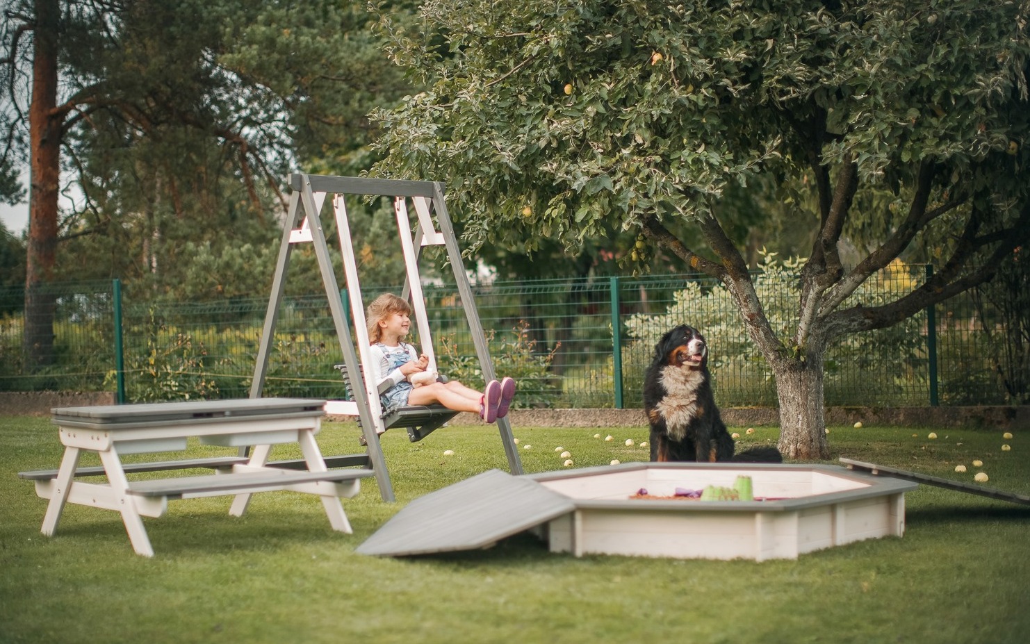 В комплект входит песочница, качели, стол трансформер со скамейками и двумя ванночками.