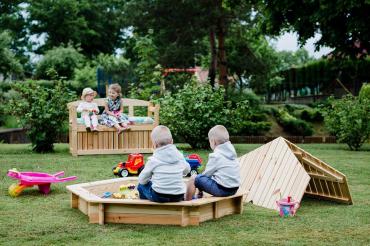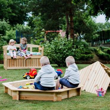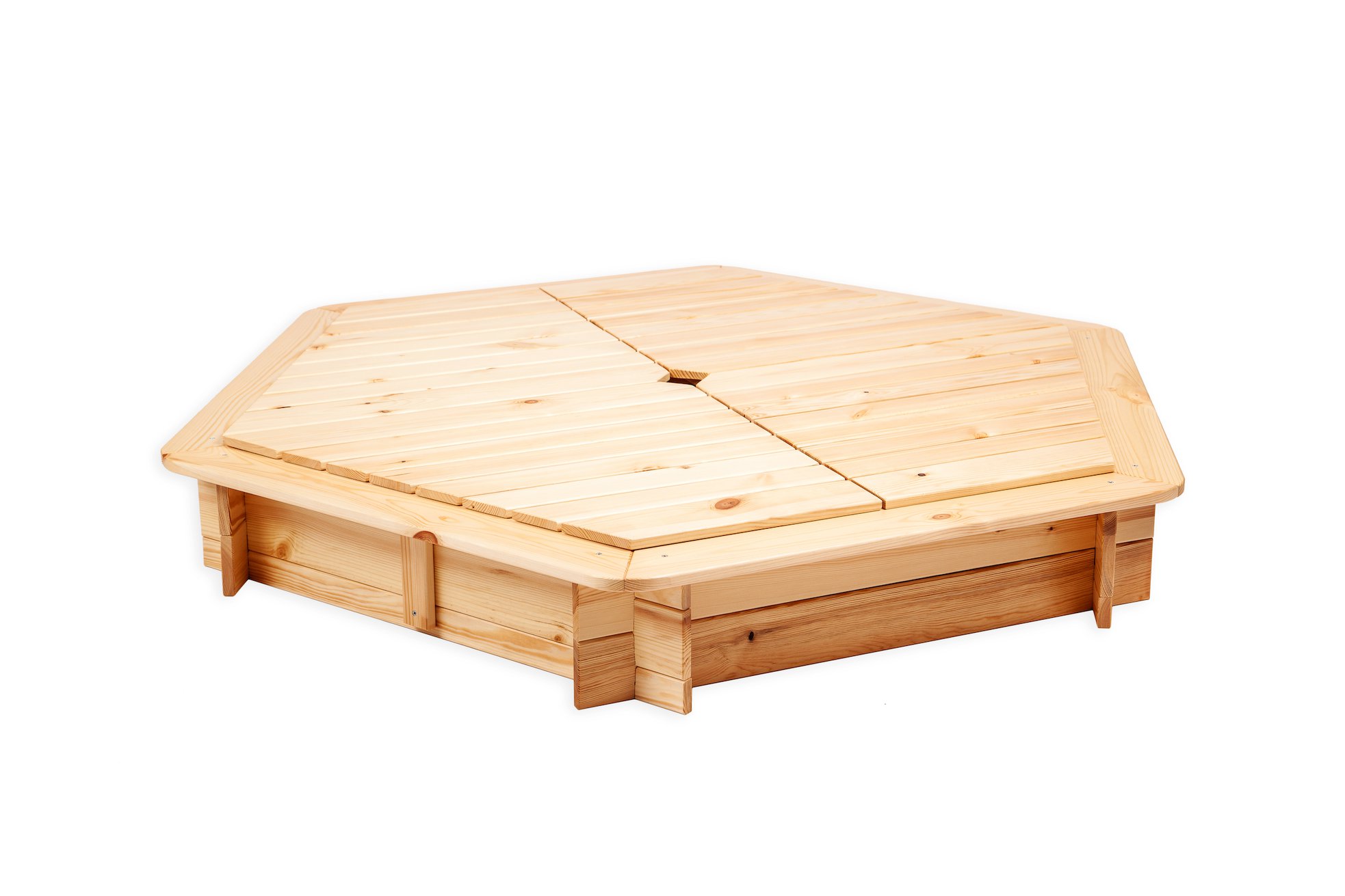 - Простая, классическая шестиугольная песочница со съемной крышкой.